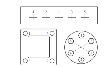 拧紧顺序:多圈同心圆组按十字交叉,由内向外逐次拧紧,如图2-12-7所示;周围排列组按十字交叉,两两相对的顺序拧紧;直线排列组按中央到两头的顺序拧紧;正方形按对角线拧紧。如图2-12-8所示。