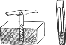 (3)螺旋锥取螺器法。螺旋锥取螺器为杆状旋转工具,取螺器尖端呈四角或五角棱状,在杆身上有类似钻头的螺旋槽,但其旋向与钻头相反,在尾部有四方头与扳杆连接,如图2-12-4所示。使用时,用小于螺桩直径的钻头在螺桩断口钻孔,然后把取螺器敲入孔内,逆时针旋转。由于棱尖和螺旋槽方向均在反时针旋转时与孔壁增加摩擦作用,因此可将螺桩取下。也有全杆均为四方形的取螺器,其作用一样。