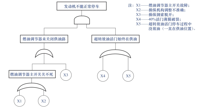 发动机停车时,燃油调节器主开关关闭,切断供油,发动机熄火停车。当Ng降至40%时超转放油活门关闭供油路,同时接通甩油盘到放油口的放油路。燃烧室内的剩余P2空气将甩油盘、喷射油道内的剩余燃油,通过超转放油活门从放油口排出。根据燃油系统图和发动机停车原理,发动机不能正常停车的故障树如图3-3-4所示。
