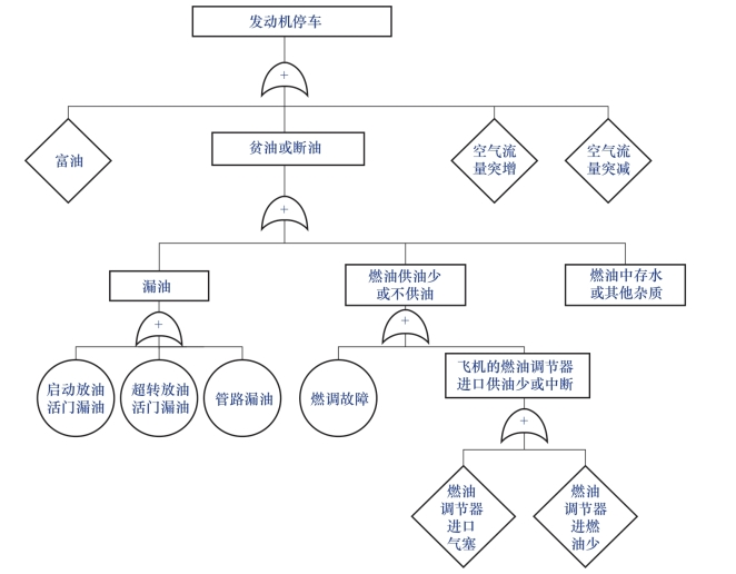 根据发动机及燃油系统的工作原理,管路泄漏、启动放油活门漏油、超转放油漏油和燃油调节器故障,可导致发动机因贫油或断油而停车,相应的故障树如图3-3-3所示。