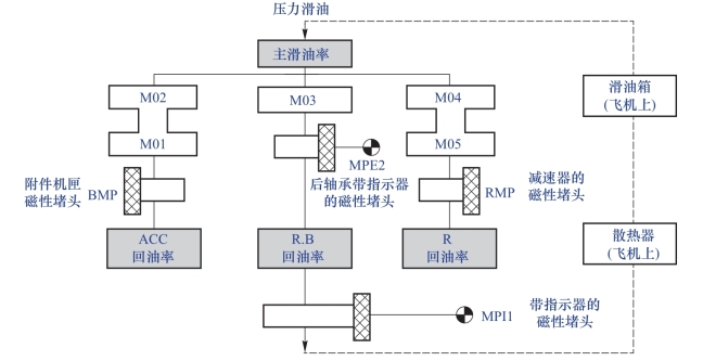 2019年4月2日,某型涡轴发动机,在飞行后落地时金属屑警告灯亮,发动机其他参数和指示灯均正常。地面检查发动机总回油路的带指示器磁性堵头MPI1上有小片状金属屑,M01单元体磁性堵头BMP和主滑油滤上也有较多小片状金属屑,后轴承回油路的带指示器磁性堵头MP2和M05单元体磁性堵头RMP上未发现金属屑。