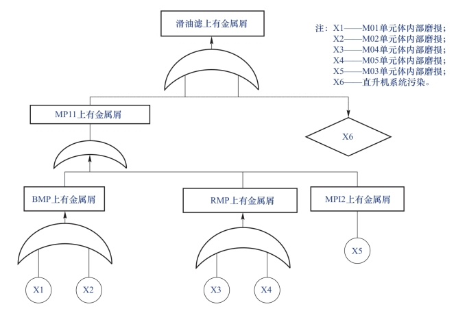 根据图3-3-1所示的发动机滑油系统工作原理,画出发动机金属屑故障的故障树,故障树如图3-3-2所示,得到6个底事件(金属屑来源)。