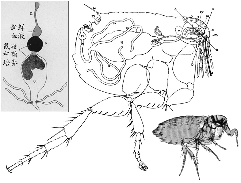 图2.4.3 鼠蚤解剖:鼠蚤左侧小图为提供鼠疫杆菌培养并被血凝块阻塞的跳蚤的腺胃(P),S代表胃,O代表食道;右侧小图为1914年印度鼠疫调查期间以化学方法保存并拍摄的普通雌性鼠蚤:具带角叶蚤