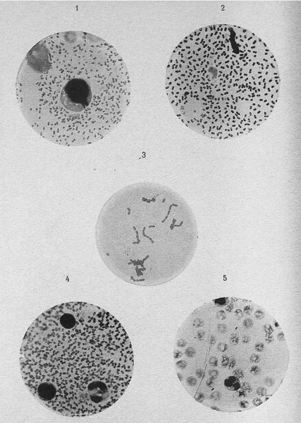 图2.4.2 耶尔森的显微图像:1. 鼠疫患者的淋巴结;2. 鼠疫感染的死鼠淋巴结;3. 肉汤中的鼠疫细菌培养;4. 接种鼠疫的小鼠淋巴结;5. 鼠疫患者死后五分钟内采集的血液,照片中有两种细菌存在