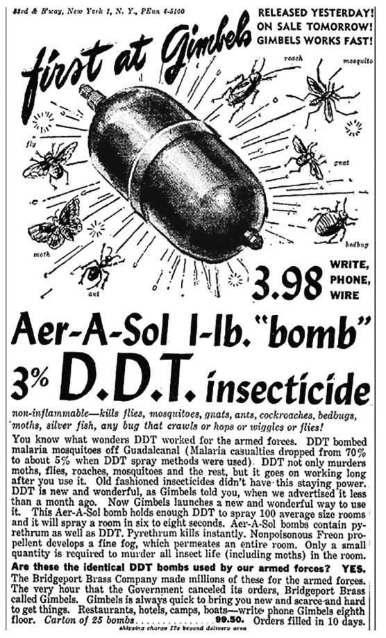 众所周知,滴滴涕在军队中制造了众多奇迹。它剿灭了瓜岛上携带疟疾的蚊子(喷洒滴滴涕后,疟疾死亡率从70%下降到约5%)。它不仅能即刻杀死飞蛾、苍蝇、蟑螂、蚊子等动物,而且在使用过后很长时间内仍然有效。老式杀虫剂没有这种持久性。滴滴涕是新颖而奇特的东西,正如我们一个月前在吉贝尔斯百货的广告中所说的那样。现在吉贝尔斯又要推出一种滴滴涕的使用新招。一款名叫阿莱索的炸弹含有充足的滴滴涕,足够喷洒100个普通大小的房间,而喷洒一个房间只需6~8秒。阿莱索炸弹除了含有滴滴涕,还有除虫菊。除虫菊能立即毒死昆虫,而无毒氟利昂推进剂则会产生细雾,弥漫整个房间。因此,只需少量即可消灭室内所有的昆虫(包括飞蛾)。这些就是我们的军队使用的滴滴涕炸弹吗?没错!布里奇波特·布里斯公司为军队制造了数以万计的阿莱索炸弹。就在政府取消订单的那一刻,他们立刻给吉贝尔斯打电话。吉贝尔斯百货总是能迅速带给你流行的、稀缺的以及和不易得到的东西。饭店、旅馆、营地、船舱等等,均可适用。我们在吉贝尔斯百货的八楼,可写信订货或电话订货,每箱25枚炸弹,99.50美元。订单10日内发货。