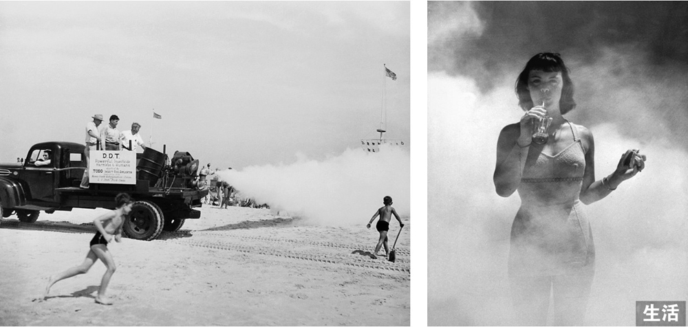 图3.3.4 左图为1945年7月8日在琼斯海滩进行的滴滴涕试验;右图为模特凯·赫弗农的现场演示