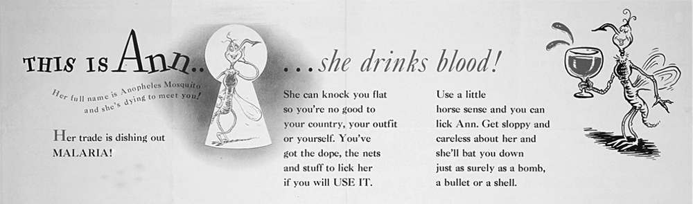 图3.3.1 西奥多·S.盖泽尔(即苏斯博士)为美国军方的疟疾宣传活动专门绘制了一系列漫画,将蚊子描绘成一只雌性恶魔
