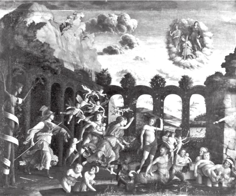 在人的所有品质中,美德是最为尊贵的品质。智慧的美德被人视若珍宝。图为安德烈亚·曼特尼亚的作品《美德的胜利》(1502年)。画中,以石栅栏围住的池塘里充满了邪恶,而左边身穿黄色战袍者,就是智慧、技术及工艺之神密涅瓦。她正驱赶着懒惰者向前走,并营救被人马兽胁迫的月亮女神黛安娜。