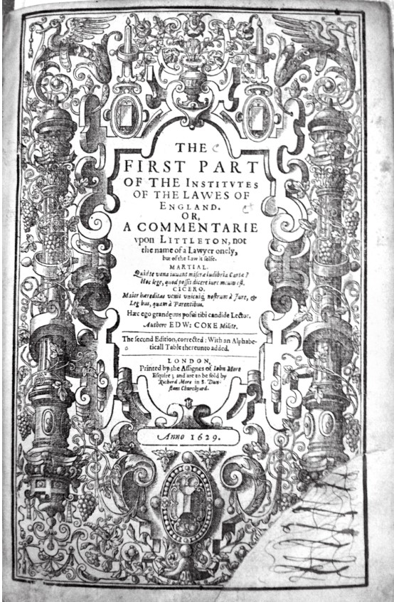 爱德华·柯克爵士(1552—1634年),英国著名的普通法学家。与霍布斯、菲尔默、洛克、哈林顿等人所讨论的法律问题不同,他主要讨论的并非一般性的法律问题,而是英国法律问题的一部分。他所著的《柯克论利特尔顿》,全名为《柯克之利特尔顿土地保有权释评》,是对法学家托马斯·利特尔顿爵士的《土地保有权》一书所进行的评释。