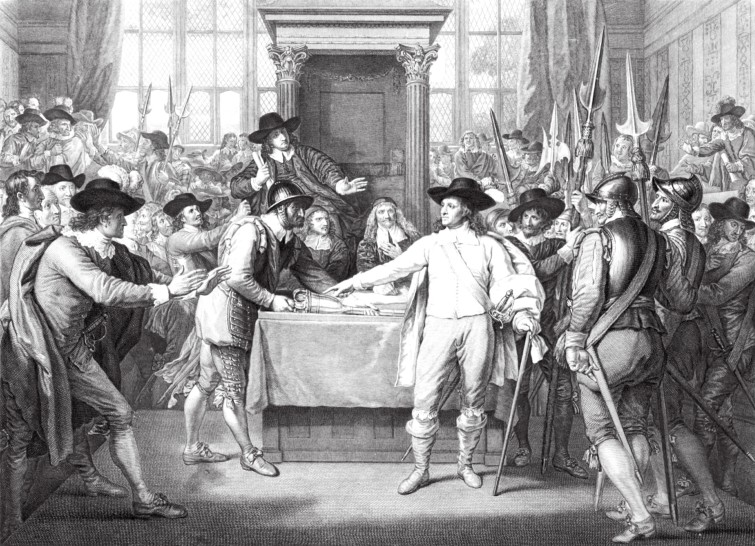 1645年,由于克伦威尔屡建战功,英国议会授权他改组军队。于是,克伦威尔在铁骑军的基础上组成“新模范军”,并指挥这支军队战胜了王党的军队。1649年1月30日,克伦威尔在人民的压力下,以议会和军队的名义处死国王查理一世。5月,他宣布英国为共和国,成为了实际军事独裁者。但是,由于议会的意见经常与他相左,他越来越感觉到议会的存在对于自己是一种制约,便于1653年4月20日解散议会,自任“护国公”。