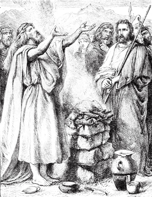 古代以色列人献祭的时候,他们会从羊群中捉来一只羊羔,宰了它,放在坛上,放火烧了它。这种用火烧全兽作为献祭的方式被称为燔祭。这种祭不可为任何人留下一点牲畜的肉,被认为是最好的一种祭。在以色列人的帐幕里,祭司每天献两只羊羔为祭。图为一个以色列人向上帝献上燔祭。