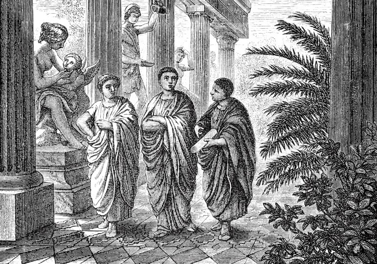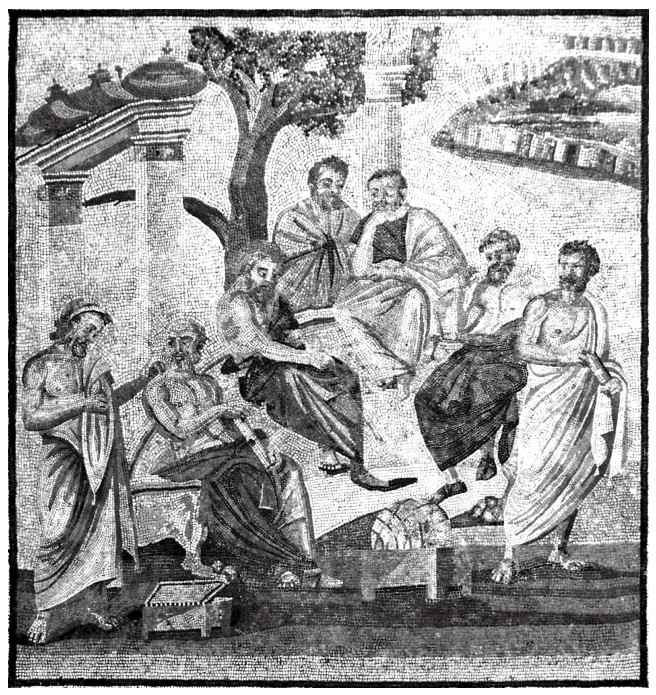 在雅典人打败了波斯军队并夺得了海上的统治权之后,他们获得了对欧洲和亚洲位于爱琴海中的全部岛屿以及沿海城市的统治权并逐渐繁荣起来,正如圣路加所说,国内外那些无所事事的人就“只将新闻说说听听”[5],或是向城邦中的年轻人公开宣讲哲学。每一位老师都会找一处讲学的地方。柏拉图讲学的公共场所被称为“学园”,这个名称源自一个名为阿卡德摩的人[6];亚里士多德则是在潘神庙的步行道上讲学。这里被称为“吕克昂学园”。有些人则是在画廊(即商人们摆地摊卖货的拱廊)讲学,还有一些人则是在其他一些地方教导别人或与人讨论他们的见识来消磨闲暇时光。还有一些人则没有固定的场所,只要是能将城市中的年轻人召集在一起听他讲话就可以。卡涅阿德斯[7]在罗马担任使者的时候也这样做,因而加图[8]劝告元老院尽快让其离开(罗马),担心年轻人喜欢听他的高谈阔论(他们认为是这样)而导致败坏年轻人的品行。
