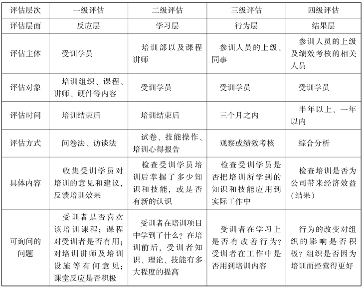 柯克帕特里克将培训效果分为四个递进的层次,分别为反应层、学习层、行为层、效果层,并且提出在这四个层次上对培训效果进行评估。
