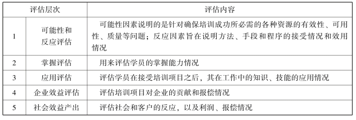 考夫曼还认为,培训所产生的效果不应该仅仅对本企业有益,它最终会作用于企业所处的环境,从而给企业带来效益。因而,他又加上了一个层次,即评估社会和客户的反应,从而形成了五个层次。考夫曼五层次评估模型如表8-2所示。