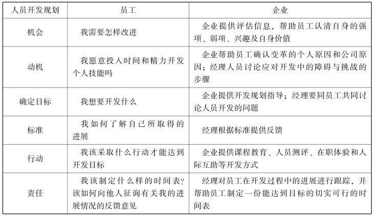 员工开发规划过程包括了解人员开发需求,选择开发目标,明确员工和企业为达到目标需采取的行动,确定工作进展测量的方法,制定员工开发时间表。表9-1列出了员工开发规划的过程,它规定了员工和企业各自应承担的责任。员工开发活动的一个发展趋势就是由员工自己来制定规划过程。一般来说,员工开发方式取决于开发需求和开发目标。因此,为了确定自己的开发需求,员工要知道自己的目标、兴趣,自身的能力以及他人对自己的期望。员工现有的工作能力和兴趣与其期望工作或职位所需能力的差距,也可能会导致开发需求。