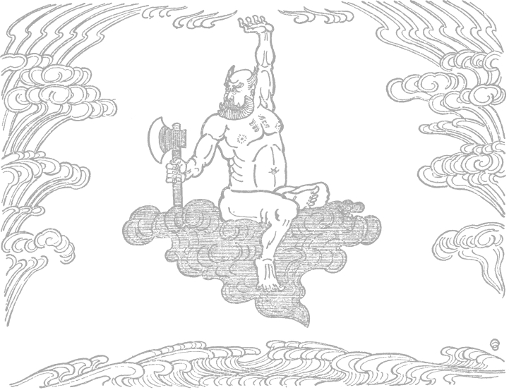 后来,完成了开天辟地大业的盘古还是死了。他临死时,身体发生了很大的变化:他呼吸的气息变成了风、云,发出的声音变成了雷霆;他的左眼变成了太阳,右眼变成了月亮;他的四肢和躯干变成了四极五岳[1],血液变成了江河,筋脉变成了山川道路,肌肉变成了良田;他的胡须头发变成了天上的星辰,汗毛变成了地上的花草树木;他的骨骼牙齿变成了金属、石头,体内的精气真髓变成了明珠、宝玉;他的汗水化成了甘霖雨露,就连寄生在他身上的小虫,也随风感受了他的灵气,变成了生活在大地上的黎民百姓。
