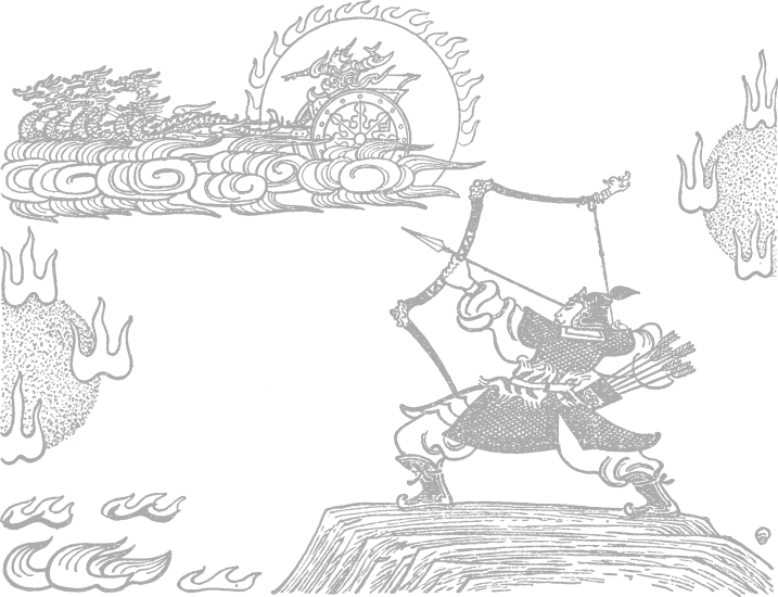 可是,这十兄弟没想到,他们同时在天空出现,下方的百姓和庄稼草木怎能受得了?他们的父亲要靠臣民拥奉才能保住上天神帝的位子,如今出了这样的事,他岂能坐视不管?天神羿若不是受命于帝俊,怎么会到人间去驱除妖孽?他如果制伏不了这十个闯祸的家伙,怎么去向帝俊交代?而且羿本来就以善射著名,又带了天帝赐给的神弓神箭,这分明是有备而来。只可惜,那十个太阳兄弟只顾了眼前痛快,对这些根本就没仔细想过。