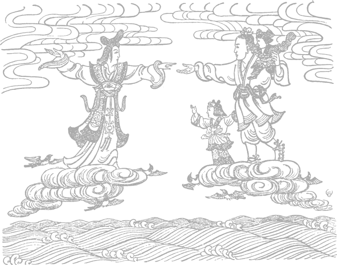 织女正被王母娘娘和众天神强拉硬扯着,一步三回头地往天宫走,忽然隐隐约约听到后面传来牛郎的呼唤和儿女们的哭喊声。她回头一看,见丈夫正挑着儿女,不顾一切地从远处跑来。织女奋力挣脱,要回去见牛郎和自己的孩子。牛郎也越跑越近,眼看着他们夫妻就要会合在一起了。