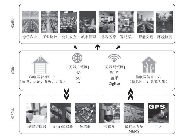 物联网的组成大致可分为三个层次:感知层、网络层和应用层。底层是用来感知数据的感知层,第二层是数据传输的网络层,最上面则是内容应用层,具体如图2-1所示。