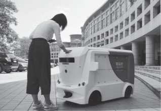 无人车配送模式是指采用无人车配送(见图8-4)来进行配送的模式。无人车配送又称为配送机器人,是指基于移动平台技术、全球定位系统、智能感知技术、智能语音技术、网络通信技术和智能算法等技术支撑,具备感知、定位、移动、交互能力,能够根据用户需求,收取、运送和投递物品,完成配送活动的机器人。