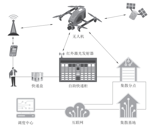 无人机配送系统包括无人机、快递柜、快递集散分点、快递集散基地、区域调度中心等,如图8-6所示。