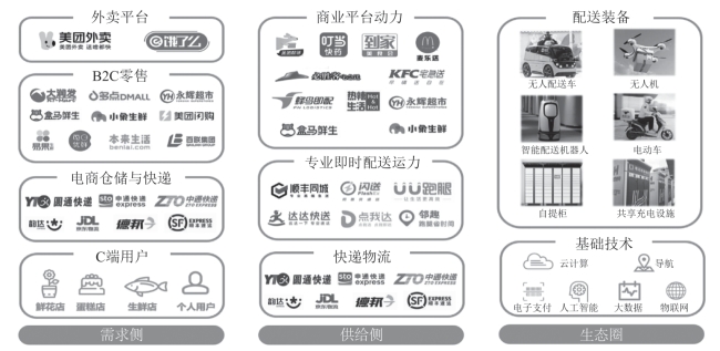 即时配送产业链图谱如图8-2所示,包括需求侧、供给侧以及生态圈。需求侧包括外卖平台、B2C零售、电商仓储与快递、C端用户等;供给侧包括商业平台运力、专业即时配送运力、快递物流等;即时配送生态圈包括配送装备与基础技术等。
