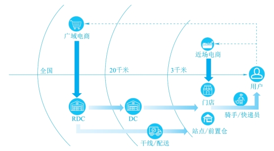 前置仓模式伴随近场电商的发展而兴起,通过在距离用户最近的地方布置小型仓储空间,快速响应用户需求,提升用户体验,是当下1小时、30分钟到家服务的核心支撑。每日优鲜、叮咚买菜、美团买菜等是前置仓模式的典型代表。近场电商兴起,推动即时配送行业发展,逐步解构广域电商,推动“前置仓/店+即时配送”末端服务网络布局形成(见图8-3)。