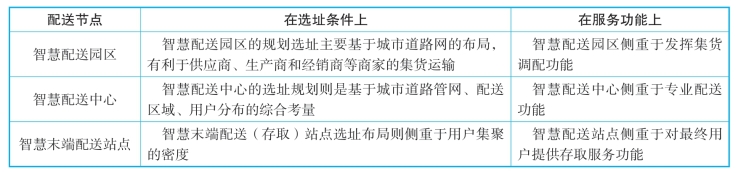 智慧末端配送站点是智慧配送体系中最接近最终用户的末端配送服务场所。它是配送企业独立设置的,与社区服务机构、具有一定规模的住宅小区、连锁商业网点、大型写字楼、企业营销机构、机关事业单位和大学校园等单位开展广泛合作设立的物流末端配送服务节点,有时还体现为自助电子快递箱、智能快递站等形式。三种配送节点的区别如表8-1所示。