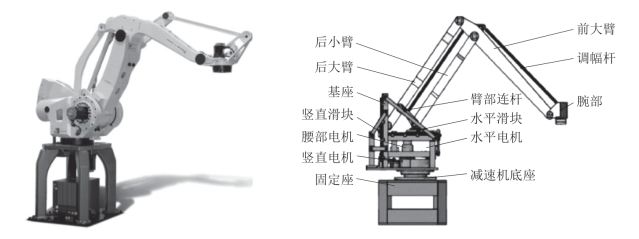 码垛机器人主要由机器人主体、伺服驱动系统、手臂结构组成。机器人主体包括固定座以及减速机底座;伺服驱动系统包含腰部电机、竖直电机和水平电机三大电机组成的电机组,中间通过竖直滑块和水平滑块连接主体;手臂结构包括前大臂、调幅杆、后小臂、后大臂。码垛机器人主要针对码垛应用设计,关节式手臂结构精巧,能便捷地集成于紧凑型后道包装环节。同时机器人通过手臂的摆动能实现物品搬运,从而使前道来料和后道码垛柔性衔接,大幅缩短了包装时间,提高了生产效率。码垛机器人可按不同的物料包装、堆垛顺序、层数等要求进行参数设置,实现不同类型包装物料的码垛作业。