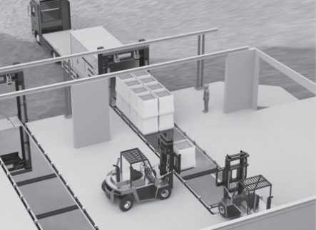 自动装卸系统的作业流程基本如下:卡车到达月台后,沿着月台上安装的卡车导向装置到达指定位置;通过视觉系统使卡车上的系统和月台上的系统对齐,然后锁定卡车;驾驶员开启自动装卸系统,货物一次性从卡车自动输送到月台,或者从月台输送到卡车上。