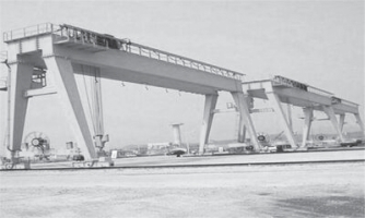 龙门吊(见图9-11)是一种大型起重机。龙门吊的横梁和立柱结构呈现门字形状,属于轨道式集装箱起重机,具有节能环保、可靠性高、起重能力大、维修保养工作量小、易于实现自动化操作等优点。