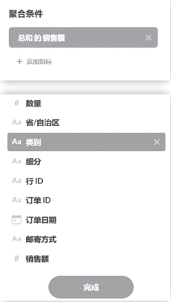 步骤二:进入“销售数据—订单”数据表,单击【聚合】按钮设置聚合条件为“总和的销售额”,如图10-5所示。