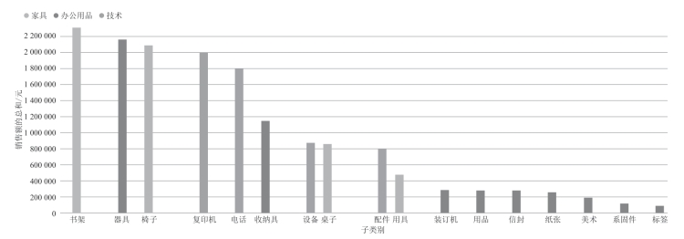 在上述步骤三的基础上在“分组条件”添加“子类别”,即可实现每个大类下各个子类产品的销售额,柱状图中不同颜色表示不同的产品大类,细分柱状表示细分产品的销售额。单击可视化图表下方的【表格视图】项,单击【销售额的总和】项,选择【降序】排列;切换至柱状图可视化(见图10-6)。根据柱状图的结果显示,可以发现所有的产品子类别按降序排列,其中家具的书架类销售额最高,其次为办公用品的器具类。通过柱状图的显示可以发现:该物流公司家具类的产品总销售额最高,其次是技术,最小是办公用品。