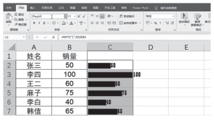 如表10-2所示,在C2输入公式“=REPT("|",B2)&B2”,完成后在字体选项中将字体更改为“Playbill”,可以再将字体填充一个颜色,这样横向条形图就生成了。