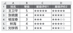 REPT函数实现星级评价,操作方法:单元格C2用实心五角星“★”显示等级,在C2中输入公式“=REPT("★",B2)”;单元格D2用实心五角星“★”和空心五角星“☆”显示等级,在D2中输入公式“=REPT(“★”,B2)&REPT(“☆”,5-B2)”(表10-1)。
