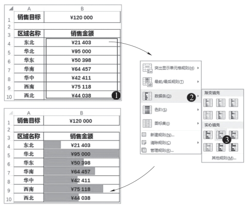 条件格式实现目标可视化的步骤如图10-2所示。通过条件格式的【管理规则】—【编辑规则】,重新设置规则,将默认的最大值类型“自动”更改为“数字”,值设置为销售目标所在的单元格即可,还能够根据目标的变化而动态调整。