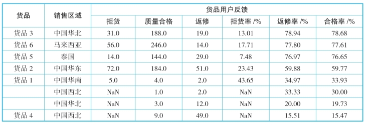 从表12-21可以看出,货品3在中国华北地区的合格率最高,但返修率也是最高的。货品5在泰国地区的销售在保证高合格率的基础上,返修率和拒货率相对较低,因此推测货品5的质量达到了要求。