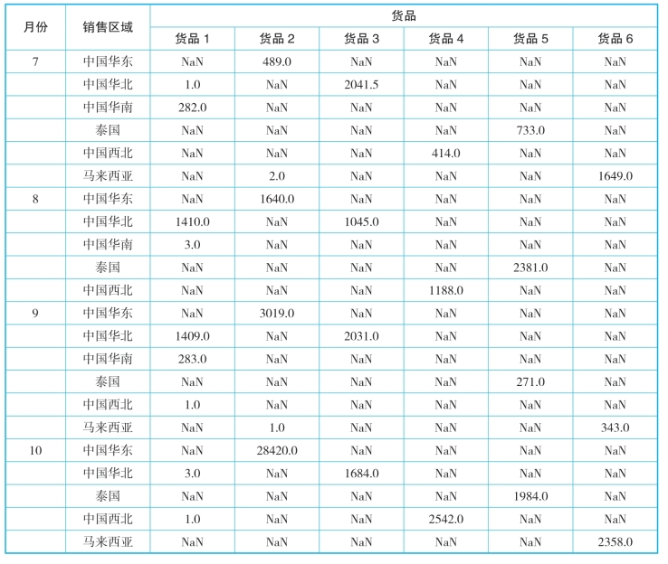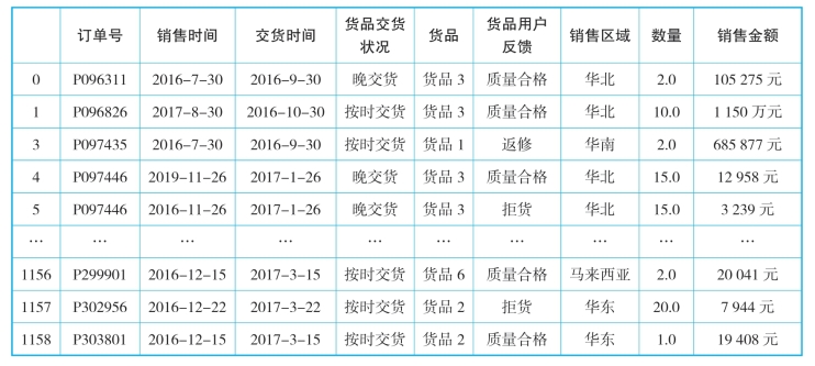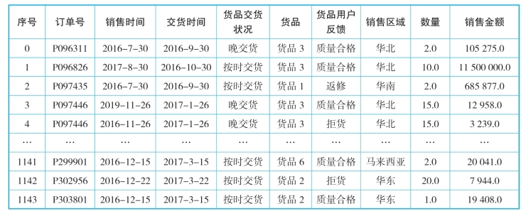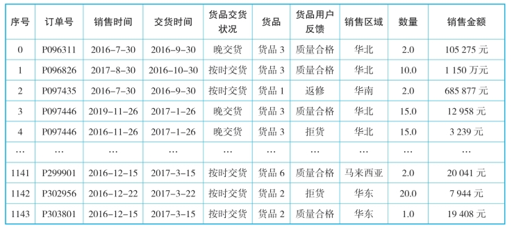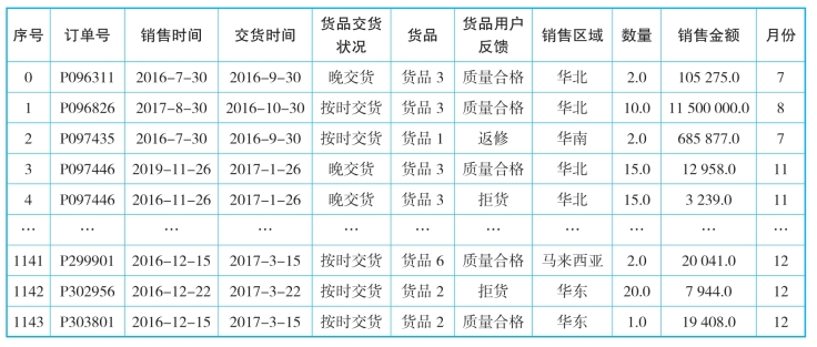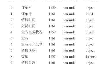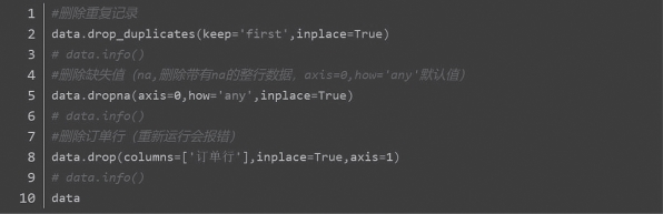 (3)对无效数据进行删除操作,如图12-10所示,包括:使用drop_duplicates( )方法删除重复记录,使用dropna方法删除带有na的整行数据,使用drop()方法删除订单行数据。删除后的输出如表12-10所示。