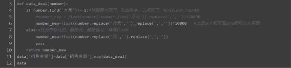 (5)编写自定义过滤函数data_deal( ),先删除逗号,转化为float类型数据。其次,如果是万元,则删除万元后再加上*10000,否则删除元并展示结果,如图12-12、表12-12。