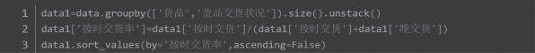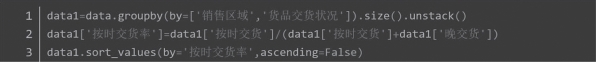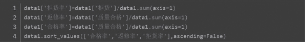 从表12-20所呈现出的结果来看,并不能明显地看出哪些商品质量存在问题。为了解决这一问题,我们使用sort_values( )方法增加合格率、返修率和拒货率,代码如图12-23所示,结果展示如表12-21所示。