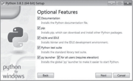 这里我们选择自定义安装,将Python安装到常用的目录,避免C盘文件过多。单击“Customize installation”进入下一步,选择要安装的Python组件,如图12-3所示。