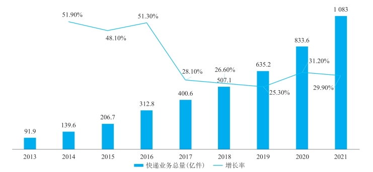 近年来,随着物流市场需求的快速提升,快递业务规模高速发展,如图12-6所示。2013—2021年,我国快递业务总量迅速增长,近两年增速虽有下降,但仍保持在20%以上的增长速度。2021年,全国快递服务企业业务量累计完成1 083.0亿件,同比增长29.9%。