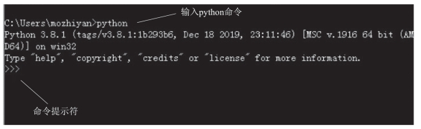 安装完成以后,打开Windows的命令行程序(命令提示符),在窗口中输入“python”命令(注意字母p是小写的),如果出现Python的版本信息,并看到命令提示符>>>,就说明安装成功了,如图12-5所示。