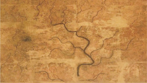 根据考古发现,我国最早的地图是湖南长沙汉马王堆三号墓中出土的地图(图2-7)。这是绘制在绢帛上的三幅地图,后来被简称为《地形图》《驻军图》《城邑图》,绘制年代大约在西汉时期公元前168年。《地形图》《驻军图》修复后基本恢复,《城邑图》因破损严重,至今未恢复。《地形图》全称《西汉初期长沙国深平防区地形图》,是第一幅用彩绢绘制的地形图。《地形图》具体描绘了汉代长沙南部,即湘江第一主要支流小水河段、南岭、九嶷山及周边地区,该地图还描绘了山峰、河流、土地和道路。