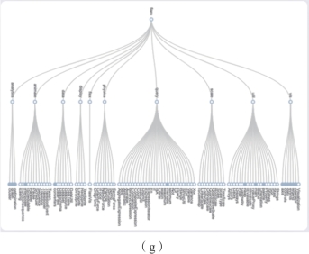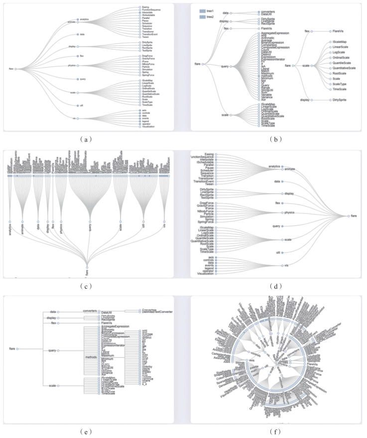 (a)从左到右树状图;(b)多棵树;(c)从下到上树状图;(d)从右到左树状图;(e)拆线树图;(f)径向树状图