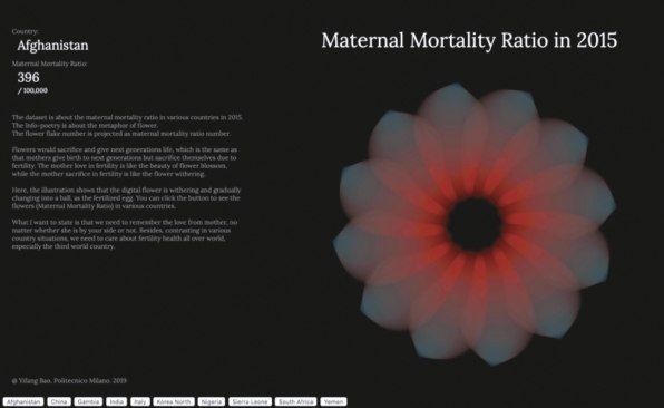 该实验室的设计师认为,作为设计师,能够熟悉使用计算机语言和工具能够大大减轻工作的负担,计算机辅助能更清晰、容易地分析数据规律。作品《2015年孕产妇死亡率》(图4-46)是以2015年产妇死亡率为主题,以花作为隐喻。因为鲜花会凋零,以给予下一代生命,以动态数字花瓣的变化呈现鲜花凋零的过程,每片花瓣的数量对应孕产妇死亡率数字。该作品呼吁人们要关心全世界的生育健康,尤其是要关心第三世界国家的生育健康。