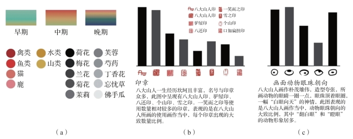 (a)用色变化;(b)印章使用比例;(c)画面动物眼珠朝向
