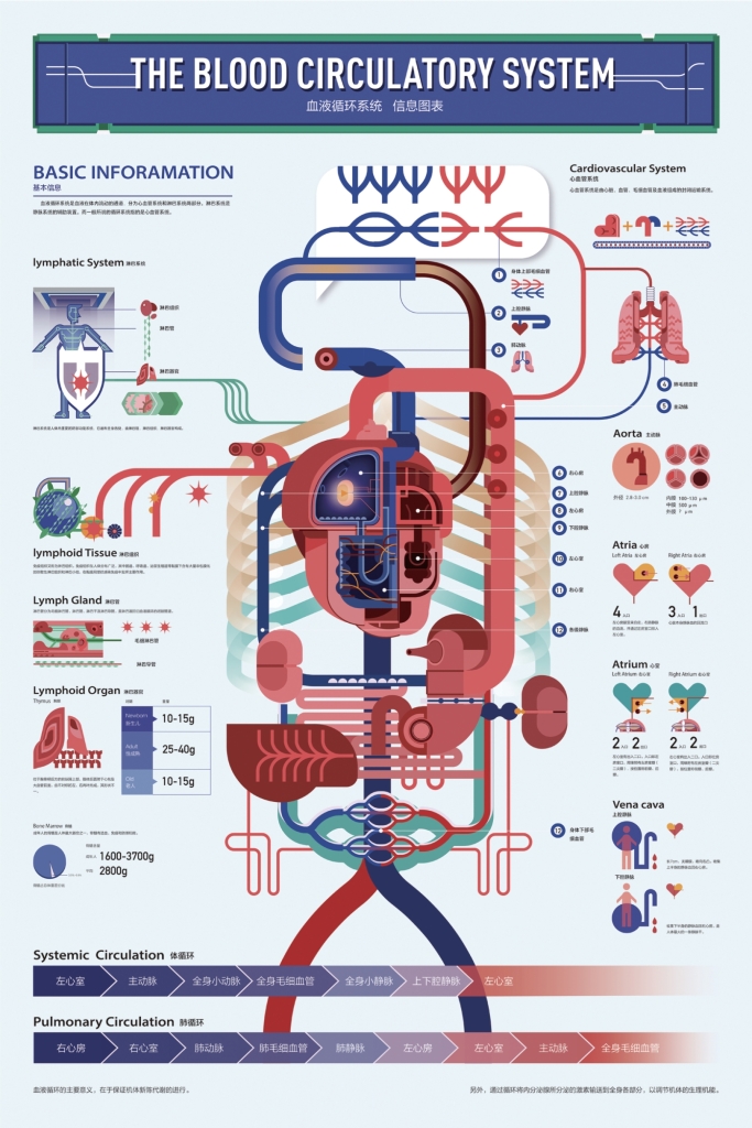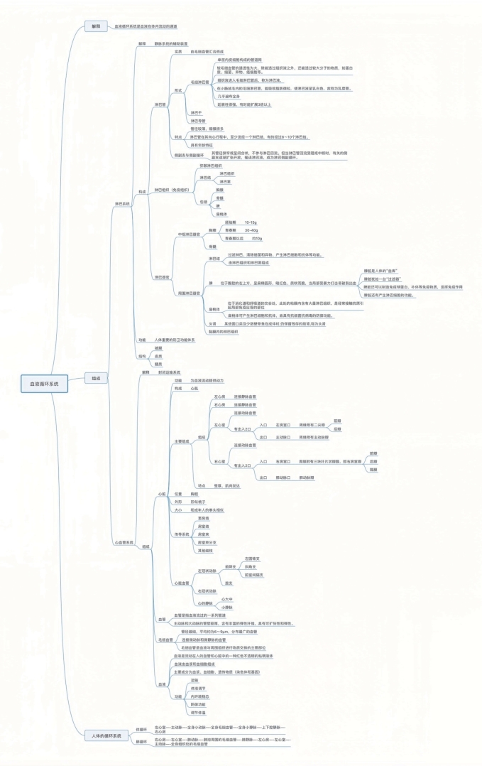 血液循环系统是血液在体内流动的通道,分为心血管系统和淋巴系统两部分。淋巴系统是静脉系统的辅助系统。一般所说的循环系统指的是心血管系统。血液循环系统由血液、血管和心脏组成。如果分为两大部分,即血管和心脏。心血管系统是由心脏、血管、毛细血管及血液组成的一个封闭的运输系统,同时许多激素及其他物质也通过血液的运输到达其靶器官,以此协调整个机体的功能,因此,维持血液循环系统处于良好的工作状态,是机体得以生存的条件。图5-29为学生整理的血液循环系统结构思维导图。图5-30为成品完成图,学生用AI软件绘制人体的血液循环系统的精美插图作为信息图主图,两侧布局相关联的器官和系统信息。图5-31是细节图,对于各个器官和关键结构信息都绘制了相对应的插图符号。
