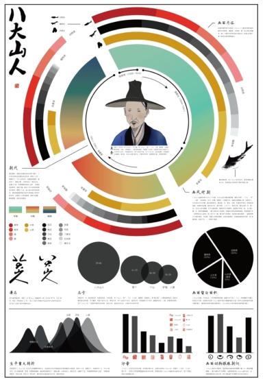 朱耷是明末清初画家,中国画一代宗师,其花鸟以水墨写意为主,形象夸张奇特,笔墨凝练沉毅,风格雄奇隽永。朱耷60岁时开始用“八大山人”署名题诗作画,他在署款时,常把“八大山人”四字连缀起来,仿佛“哭之”“笑之”,以寄托他哭笑皆非的痛苦心情。该学生梳理了朱耷一生的经历与绘画、书法、落款风格等信息进行视觉表达。图5-35为成品图。在图5-36所示的信息设计细节图中,学生还对朱耷的人生时间线上的创作变化进行了更深入的研究,用色变化、绘画细节转变等都一一展现出来了。