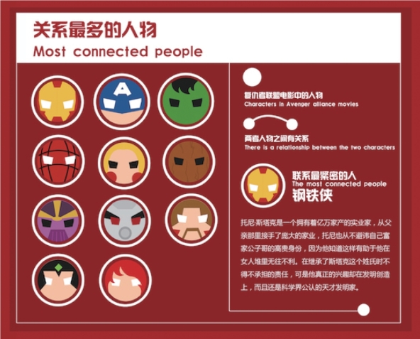漫威电影宇宙是由漫威影业基于漫威漫画角色制作的一系列电影组成的架空世界和共同世界。电视剧系列进一步扩充了漫威电影宇宙。随着多部英雄电影和电视剧的上映,漫威宇宙已经成为一个著名的IP产业,英雄人物众多。该学生设计作品的视觉展示主要是围绕《漫威宇宙》中英雄人物的信息展开,在图5-38中梳理了各个英雄之间的关系和他们组成的“复仇者联盟”的信息,学生还绘制了《漫威宇宙》中“复仇者联盟”关系最多的人物Q版形象(图5-39),增加了信息图的趣味性。